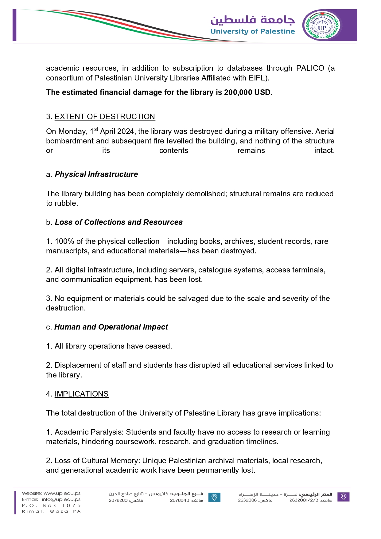 Un bilan des destructions a été dressé fin juillet 2025 par le personnel de l’université qui indique que « la perte totale l’infrastructure, les collections, les systèmes numériques et les ressources historiques constitue un coup dévastateur à l’éducation supérieure en Palestine [14] [...] ».